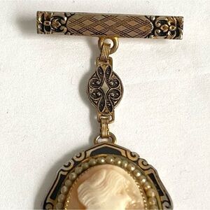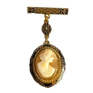 Vintage Cameo Brooch Victorian Style Carved Female Profile Portrait Gold Pin