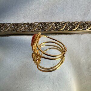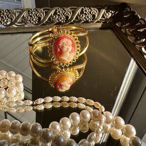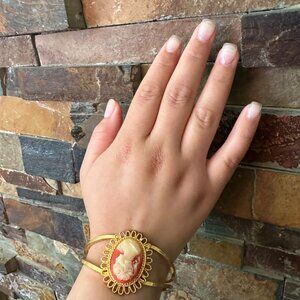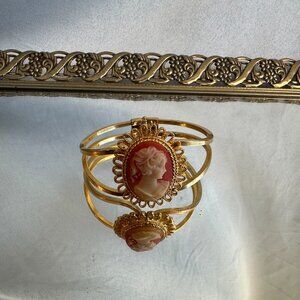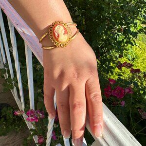 Lovely Vintage Cameo Clamper Bracelet. Elegant detailed Raisin Cameo set in oval gold tone lady frame, beautiful elegant and light to wear.Cuff that fits a 7.5" wrist. Perfect vintage conditions.