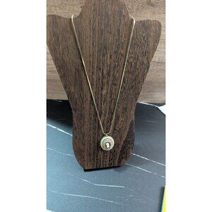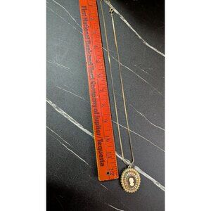 Slight tarnishing and wear on backing. Beads and rhinestones intact. Pendant = approx. 1.5 inches long. Chain length = approx. 20 inches.