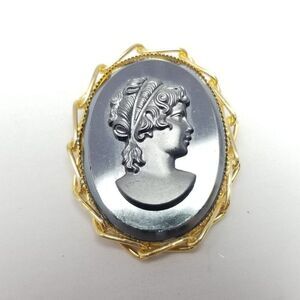Vintage Cameo Portrait Woman Profile Brooch Pendant, Gold Tone Setting, Estate