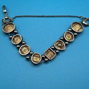 The bracelet features a series of decorative elements connected by metal links and a chain. The main components include: