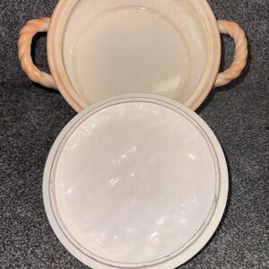Nice vintage serving bowl with lid. peach color with white fruits. Stamped on the bottom Cameo by Shafford. No chips cracks or crazing