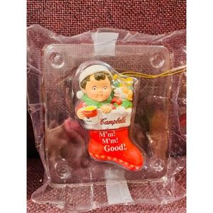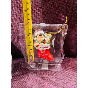 CAMPBELL’s KIDS Ornament M’m! M’m! Good! Boy & Dog In Stocking 2001 Plastic 3.75” .Please view all pictures. The ornament comes in a white box .Does have some writing . Ready to ship. Thank you.