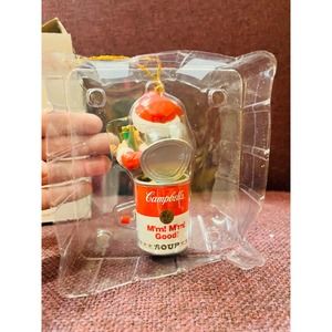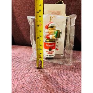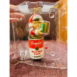 Vintage Campbell Soup Christmas ornament 2002 little boy inside a canned soup with a present. Colors are red white green. Please view all pictures. Ready to ship. Thank you.