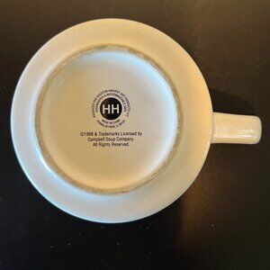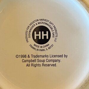 Vintage classic red and white Campbell's Tomato Soup can label logo, wide mouth, ceramic mug / handled bowl. Microwave and dishwasher safe. Measures 2” tall with a 4.25” diameter; 5.25” across including handle. Holds 9 fluid oz. Holds 10 fluid oz. 1998 Licensed by Campbell Soup Company. By Hudson Harvest.