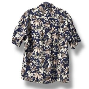 Vintage blue button up Hawaiian shirt from Campia Moda. Multicolor green and tan palm print pattern. Men’s size large.