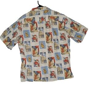 This vintage Campia Moda men's Hawaiian shirt is perfect for any casual occasion. The short-sleeved shirt features a red and white geometric pattern with floral accents and a collared neckline. The button-up closure and button accents add a touch of classic style, while the cotton fabric ensures comfort. The shirt has a regular fit and is machine washable for easy care. It also includes pockets and is suitable for all seasons. The shirt is a size XL and has a Hawaiian theme, perfect for travel, parties, or a casual night out.