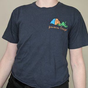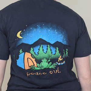 Cute vintage navy blue Peace Frogs camping short sleeve t shirt. Front has the regular logo and the back has a cute camping scene. Size small. Slightly cropped with a raw hem.
