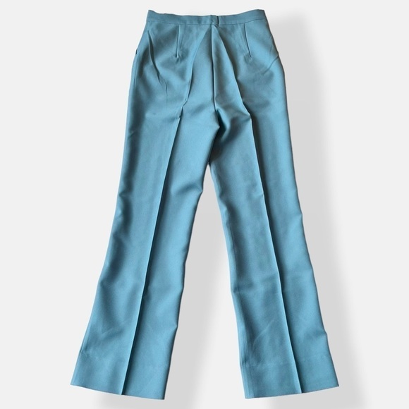 Vintage 60s early 70s Lux by Campos light dusty blue straight leg trousers pants. Small front pockets. Zipper and button fly. Stretchy a little bit. Fit like a modern size 4. Great condition. Thick woven fabric, polyester. Washable.