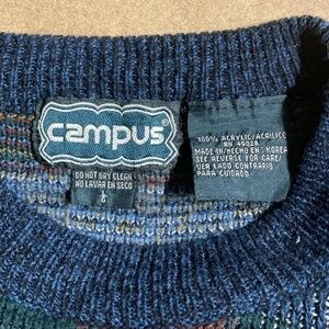 The sweater is in excellent used condition (EUC) and has been well taken care of. The brand is Campus, and it has a regular size fit. This item is perfect for anyone looking for a unique and stylish addition to their wardrobe. Don't miss out on the opportunity to own this classic vintage piece!