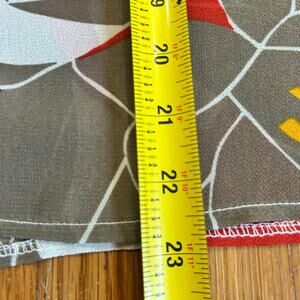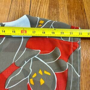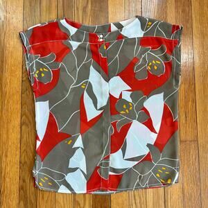 This vintage Campus Casuals sleeveless blouse features a bold abstract floral pattern in red, white, gray, and black with yellow accents. Likely from the 1960s, this retro top has a back button closure and a flattering boxy cut. Lightweight and stylish, it pairs well with high-waisted skirts or jeans for a fun, mod look.