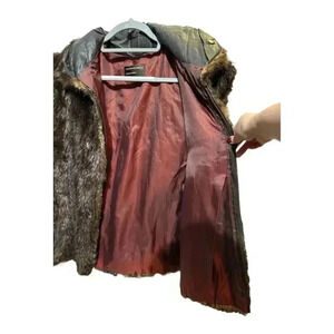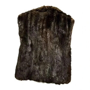 The vest medium-sized basic jacket made from natural beaver fur with a satin lining. It features a solid brown color and a button-up front closure, suitable for both casual and formal occasions. Designed for fall and winter, this vintage piece is manufactured in Korea. Pre-owned condition. Keywords: Giacca, vest, medium, beaver fur, satin lining, brown, button-up, vintage, women's jacket, fall fashion, winter wear, Korea, casual, formal.
