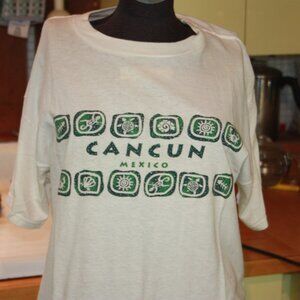 This is a Cancun tee shirt. The makers tag is heavily worn so not sure on who made the shirt. It is a double stitch shirt. It is marked as size Large and is about 27 inches long and 20 inches pit to pit. It has some wear but is in good shape.