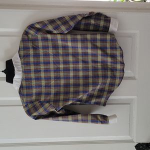 Green, blue and briwn plaid with white at collar and cuffs. Long sleeve, rounded Peter Pan collar with lace trim. Button up.
