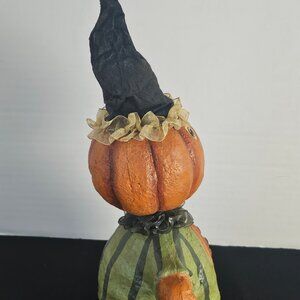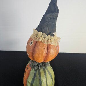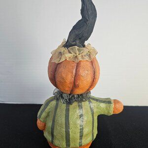 A cute vintage folk art Candy Corn Lane pumpkin man wobble head folk art figure. I purchased this from an elderly man who had a large assortment of vintage old items. He told me it was a Candy Corn Lane item. It is unbranded. I love the folk art appeal of this Halloween figure. And if you purchase it, I'm sure you will too! His hat is fabric, and so are the ruffles on his hat and neckline. His body seems to be a paper/plastered machete that's been painted. He stands 11 inches tall, 7.25 inches wide. Love that his pumpkin head wiggles and bobbles. See my video. In very good condition. Non smoking pet free home. @ ER NW Boxed