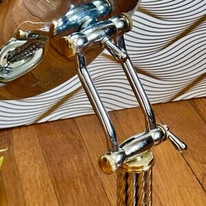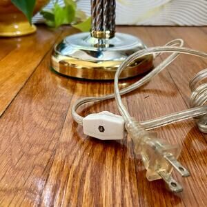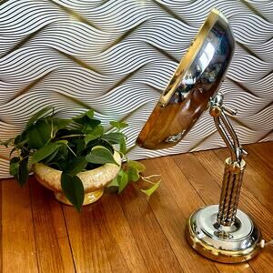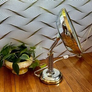 Step back into the 1990s with this vintage lighted make-up mirror, featuring a round 9.5” diameter dual-sided mirror and a stylish twisted stem on a gold and chrome base. Standing 15” tall, it’s both functional and eye-catching. Offers standard and magnified views, with built-in lighting and an adjustable tilt. Perfect for retro vanities, glam bathrooms, or collectors of 90s décor.