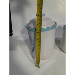 This vintage stoneware canister set of 2 features a charming design of a home, with a tweet home, sheep, bunnies, and adorable garden. It is made of high-quality Newcor Stoneware material, with a height of 6 inches and a length and width of 5 inches. The colorful multicolor design adds a touch of whimsy to your kitchen storage and organization collection. Perfect for collectors or those who appreciate unique kitchen decor, this canister is a must-have for any home. Detailed measurements in pictures. No chips or cracks
