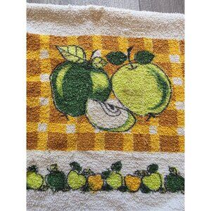 This charming vintage tea towel by Cannon features a vibrant apple design with a yellow gingham background. Made from 100% cotton, it offers durability and absorbency. The tasseled fringe adds a touch of retro style, making it a lovely addition to any kitchen decor.