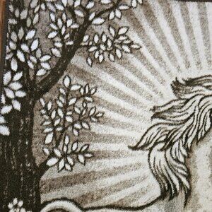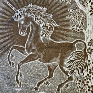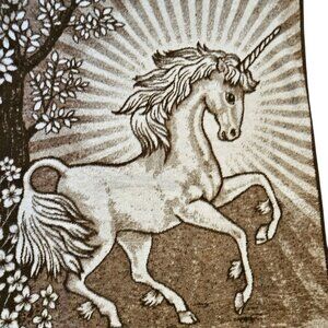 Reverse print of unicorn in forest with tree and flowers with rays coming off unicorn