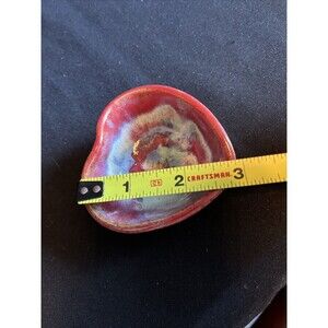 This is a vintage Canterbury Pottery miniature heart-shaped trinket bowl. It is handmade with an ash glaze finish in red & gray colors. The bowl measures 3 inches in length, 3 inches in width, and 1 inch in height, with a depth of .75 inches. It features an art deco style, vintage pattern, and incised backstamp. Perfect for occasions like anniversaries, Valentine's Day, or as a decorative piece for all occasions.
