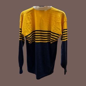 Classic rugby shirt design with bold horizontal stripes in gold and navy.