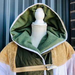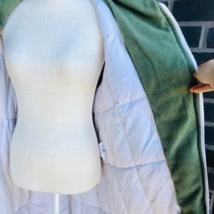 What an amazing piece! Truly one of a kind with incredible detailing throughout. Features hook and eye front closures with bone catches and suede detailing, along with a full body zip closures. Fully lined with down material and included fleece lined hood as well. The ivory material is as snow-resistant and the whole coat is wind resistant. Features deep front pockets and quilted interior.
