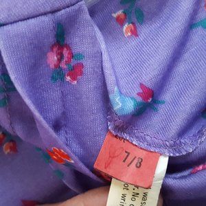 PLEASE NOTE: STIFFENED BELT A LITTLE WRINKLED AT END. There is no fabric content tag, I believe it is a polyester knit. This is a purple dress with red, pink & blue flowers. Nice for spring or Easter.
