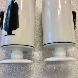 cups with a Zorro type figure in black that appears on one side.