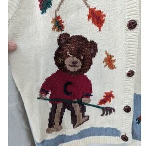 Charming vintage sweater vest by Capacity Woman in size 2X (see measurements below). Features a whimsical fall leaf scene with two bears, one raking leaves and the other holding a harvest basket. Soft cream knit base with colorful detailing. Made in China.