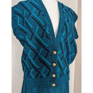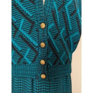 This Vintage Cape Cod Sportswear 2-piece set features a medium size green sweater with a geometric pattern and houndstooth skirt in vintage size 14. The sleeveless sweater has a V-neckline and is made of 100% acrylic knit fabric, with a retro design reminiscent of the 80s and 90s. The skirt has an elastic waist and belt loops for a comfortable fit, suitable for casual, workwear, or business occasions. This preppy outfit exudes an old money, academic, and office theme, perfect for a stylish and timeless look.