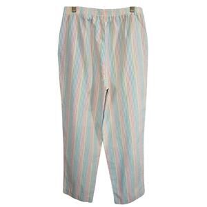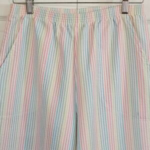 Excellent condition. Fun grandma core 2-piece outfit with lightweight button down shirt and striped textured pants. Pants have elastic waist and pockets. Pastel pink/yellow/blue/green.