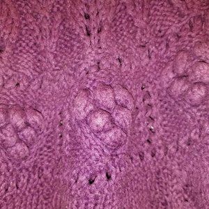 Vintage (80's/90's) cotton blend hand knitted with crochet detail long sleeved sweater. Button up. Ribbed wrists/waist. Purple color. Tagged small but runs large. Chunky, knobby cable knit sweater great for fall and winter. 55% ramie and 45% cotton. Hand wash and dry flat. No holes or stains. Pulling, loose stiches or piling at a minimal but overall good used condition. Please see photos. The photos are part of the description.