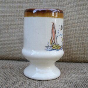 Vintage Cape May mini mug from 1960s. Stoneware with design on 1 side. Cream with two tone brown around top. Made by Nanco, sticker on bottom. Says "Victorian Cape May New Jersey". Picture is a sailboat with seagulls. 3 inches high, opening diameter 1 3/4 inches, 2 3/4 inches across handle way. Good condition, no chips or cracks. Design intact. Great for anyone who likes this place and/or souvenir items.
