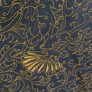 The whimsical pattern is in copper on a black background.