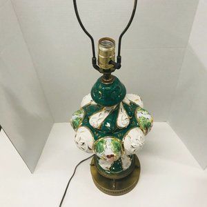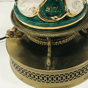 Handcrafted in Italy, this lamp showcases the intricate artistry of Capodimonte porcelain. Adorned with captivating green and white swirls, hand-painted cherubs, and a gold gilt reticulated design. Aged Brass Base with Dolphin Feet. The porcelain and metal base are in good vintage condition.