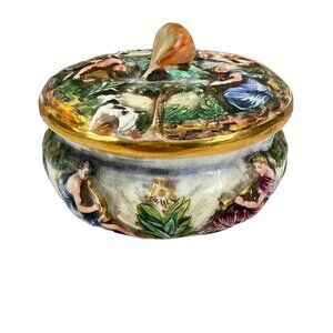 This exquisite Capodimonte trinket box showcases intricate hand-painted details and a classic Baroque design, making it a valuable addition to any collection