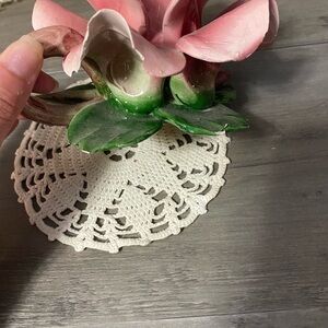 This exquisite vintage candle holder accent features a delicate floral design in soft pink and green hues. Its intricate craftsmanship adds a touch of sophistication to any room, making it a perfect decorative piece for your home. Ideal for enhancing the ambiance, this accent is both stylish and functional.