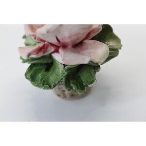 Capodimonte porcelain basket featuring two large hand-formed roses in pink and yellow with green leaves. The twisted handle and detailed floral petals showcase the craftsmanship Capodimonte porcelain is known for. Market on the base with the traditional Capodimonte "N" with crown stamp. Apprx 4.5" tall, 4.5" wide