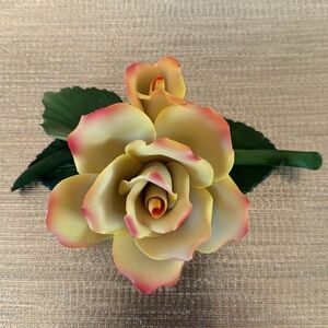 Beautiful Vintage Capodimonte Porcelain Bright Yellow Rose with a Bud. Very detailed hand made and hand painted in Italy. Stamped at the bottom. Please inspect all pictures very tiny chips barely seen. It looks one small bud is missing please see last picture.