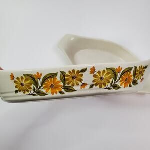The Vintage Capri Bake Serve 'n Store Stoneware Serving Dishes 2 PC. Set in Floral pattern is a charming addition to any kitchen. Made of beige stoneware with a glossy finish, these oval-shaped casserole dishes feature a flower theme in a mid-century modern style. With features like oven, refrigerator, freezer, and microwave safe capabilities, these vintage original dishes from the Capri brand are practical and stylish for serving and storing meals. Imported from Japan, these dishes offer a touch of retro nostalgia to your table setting.