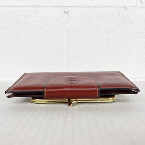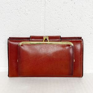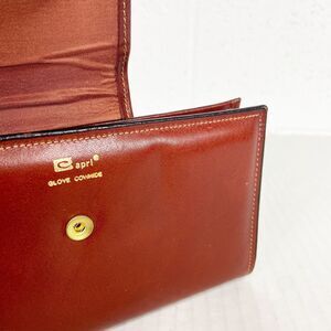 Vintage Capri wallet made of a rich brownish-red glove cowhide, with brand logo in snap closure, coin compartment with kiss lock closure, interior has a slot, photo/card holder and bill compartment.