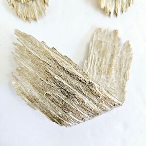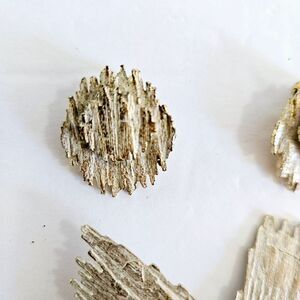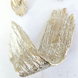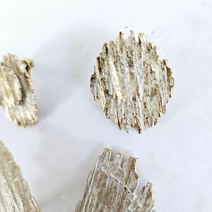 This is a gorgeous vintage demi parure brooch and earring set by Capri. Based on the signature, I believe that this is likely from the 1950's. Both the brooch and earrings are signed "Capri" on the back in cursive with the copyright symbol. This is the signature for Capri Jewelry Inc high end costume jewelry in the mid 20th century to the mid 1970's. This set is made with a tooled finished gold tone metal that is brushed with a matte white enamel. They were created in a lovely organic shape reminiscent of mineral agate, organic quartz, or petrified wood. The earrings are clip on style are are layered with two sheets of metal for a 3D silhouette. The set is in excellent vintage condition. In fact, I can't seem to find any flaw. Beautiful vintage gems.