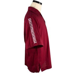 A timeless crimson red work shirt that seamlessly blends professional functionality with vintage aesthetic, featuring embroidered details and distinctive striped accent.