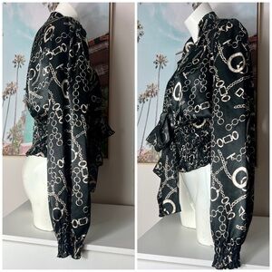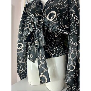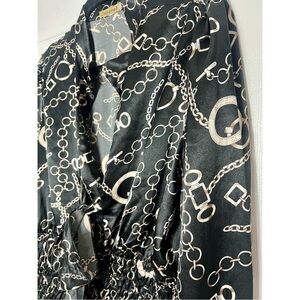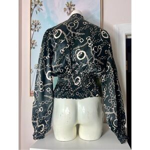 Vintage Caramel Black Satin Paris Chain Print Pattern V-Neck Blouse Size Large