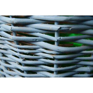What looks like a covered blue straw laundry basket with a ginormous wine bottle inside.