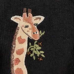 Stylish black cardigan featuring a playful giraffe design. Perfect for adding a unique touch to your outfit.