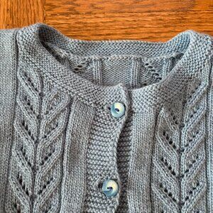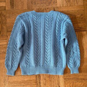 Beautiful patterned knit button front sweater in a trendy blue (first two photos are true to color). Banded trim.