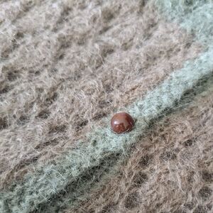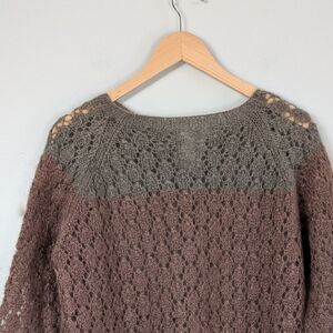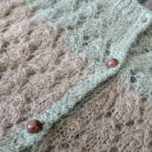 Hand-knit button up cardigan sweater, size estimated as women's large. Muted mauve (grayish pink/purple) and gray with brown vintage buttons. Fuzzy knit in a natural or natural fiber blend- mohair? (acted like natural fiber during burn test). Ideal for cottagecore, grandma, delicate, feminine, and dainty vibes. Perfect for layering, fall, winter, business casual, and weekend.