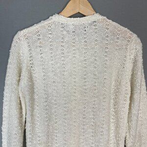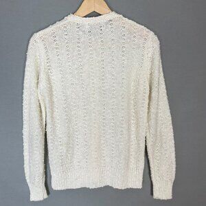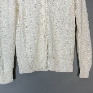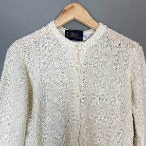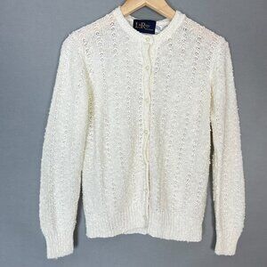 Vintage LeRoy women's white textured knit cardigan sweater with pearly-colored buttons, long sleeves, and round neck. 100% Acrylic.