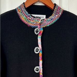 Vintage Cardigan Sweater The Michael Collection Black Rainbow Boucle Trim Size M